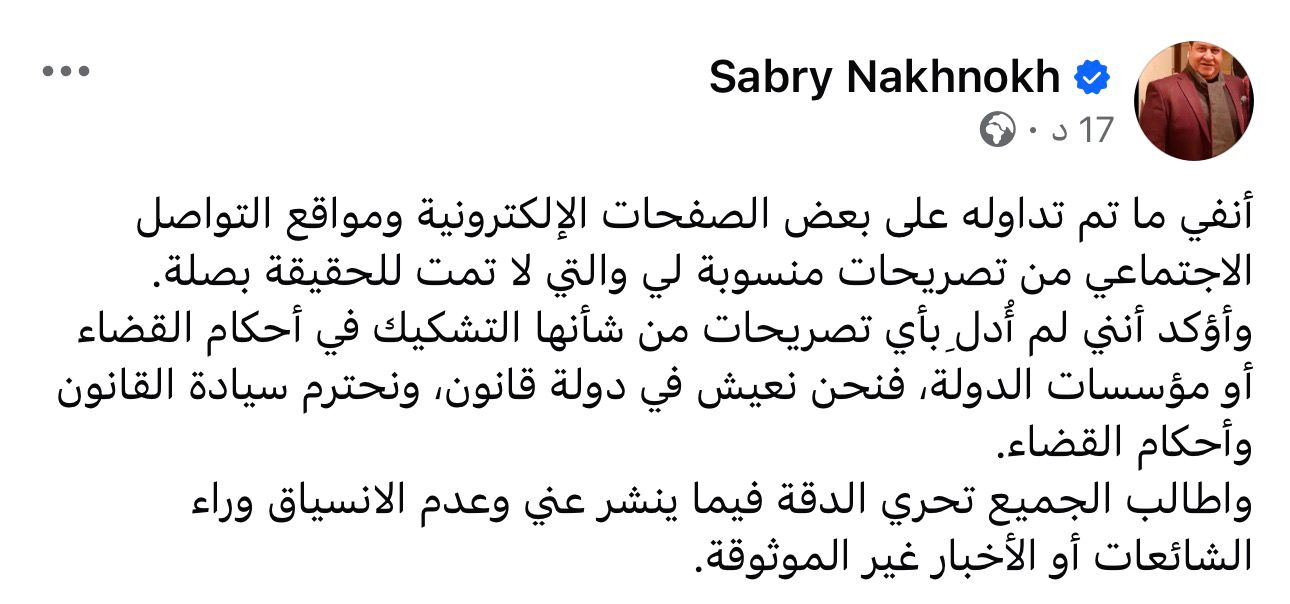 صبري نخنوخ ينفي تصريحات منسوبة إليه.. ويؤكد احترامه الكامل للقضاء ومؤسسات الدولة