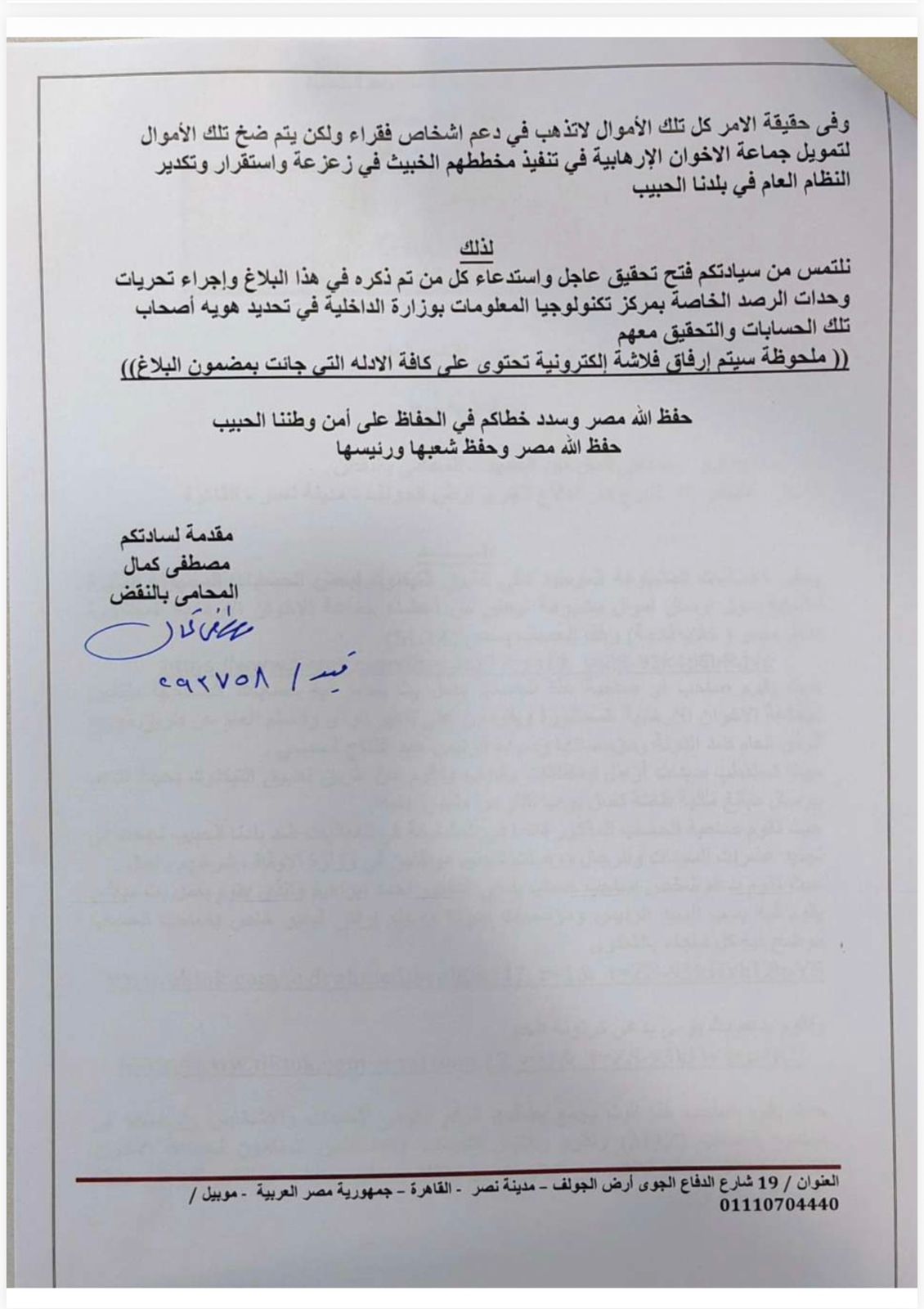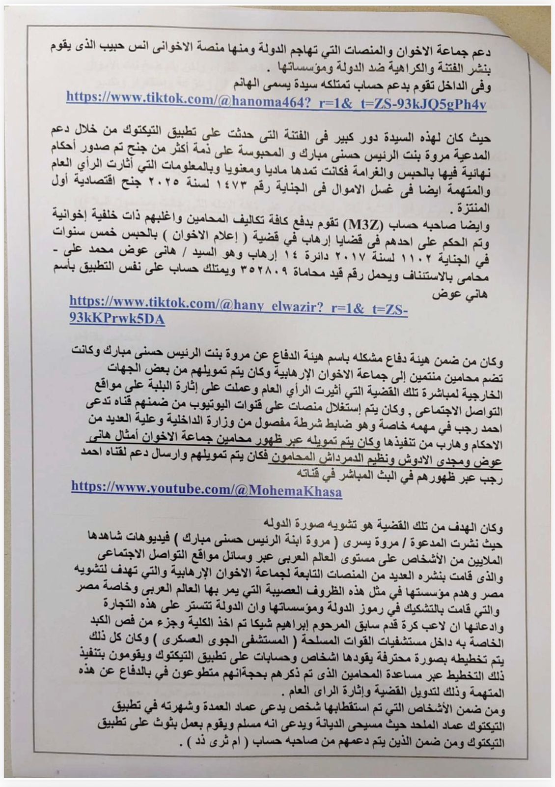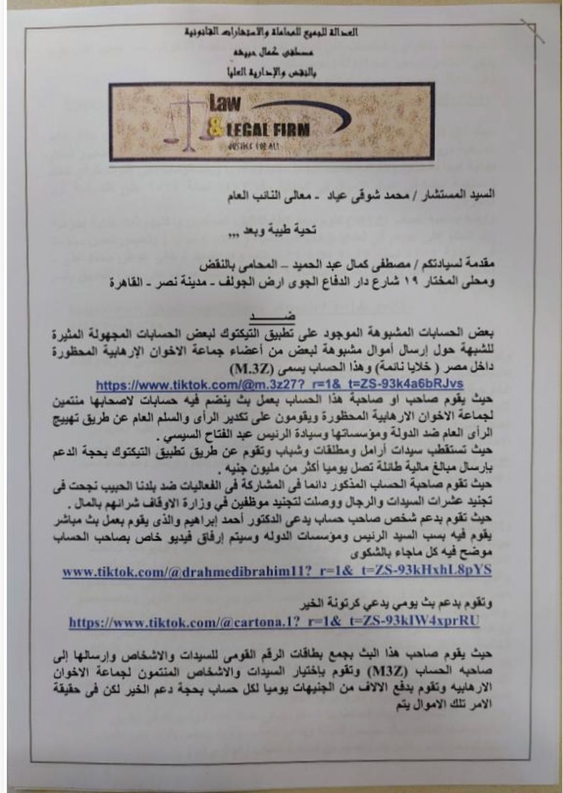تقدم مصطفى كمال المحامى بالنقض ببلاغ رسمي إلى المستشار محمد شوقي عياد النائب العام، يتهم فيه عددًا من الحسابات على تطبيق «تيك توك» بالضلوع في جمع أموال مشبوهة، يُشتبه في توجيهها لتمويل عناصر تابعة لجماعة الإخوان الإرهابية المحظورة، فضلًا عن استخدامها في نشر الفتنة والتحريض ضد مؤسسات الدولة.